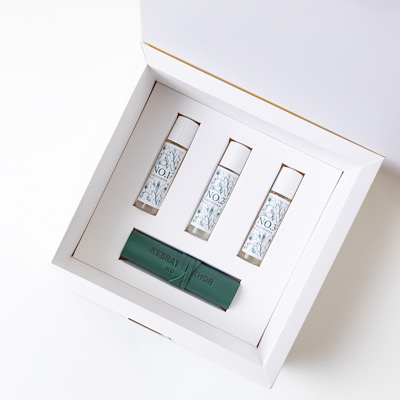 "Icons" Set by Kesrat Bukhor. An exclusive curation of our top 3 fragrances (15ml each), accompanied by a luxurious leather pouch designed to elegantly protect and carry your favorite scent inside your bag as your daily companion