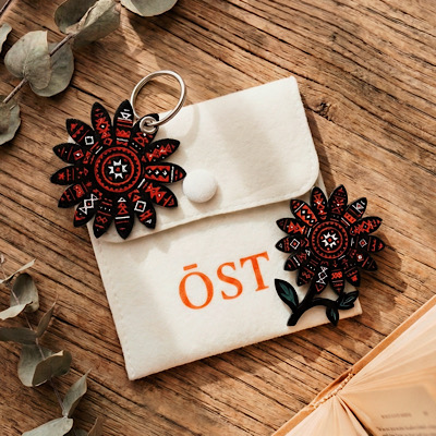 A brooch and keychain set inspired by the famous wild Nuwair flower, featuring traditional Sadu patterns